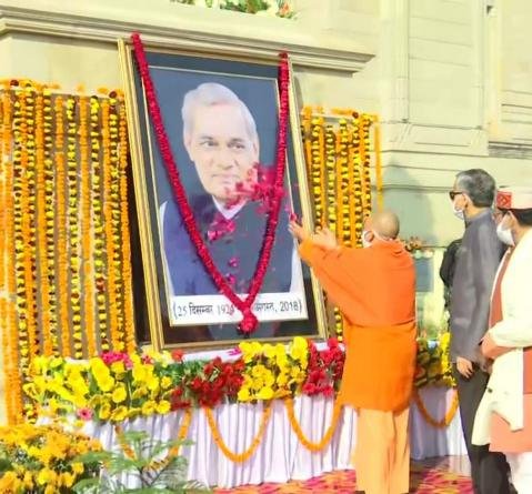 देश के सबसे लोकप्रिय प्रधानमंत्री के रूप में विख्यात स्वर्गीय अटल बिहारी वाजपेयी की 98 जयंती पर उत्तर प्रदेश के मुख्यमंत्री योगी आदित्यनाथ के साथ केन्द्रीय मंत्री धर्मेन्द्र प्रधान ने लोक भवन में उनकी प्रतिमा पर पुष्पांजलि की। इस अवसर पर उप मुख्यमंत्री केशव प्रसाद मौर्य, भाजपा उत्तर प्रदेश के अध्यक्ष स्वतंत्र देव सिंह, लखनऊ की मेयर संयुक्ता भाटिया तथा उत्तर प्रदेश के मुख्य सचिव आरके तिवारी ने भी लखनऊ में उन्हें श्रद्धांजलि दी