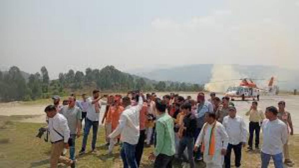गरुड़ के मेलाडूंगरी हैलीपैड पहुंचे सीएम पुष्कर सिंह धामी को कार्यकर्ताओं ने जोरदार स्वागत किया